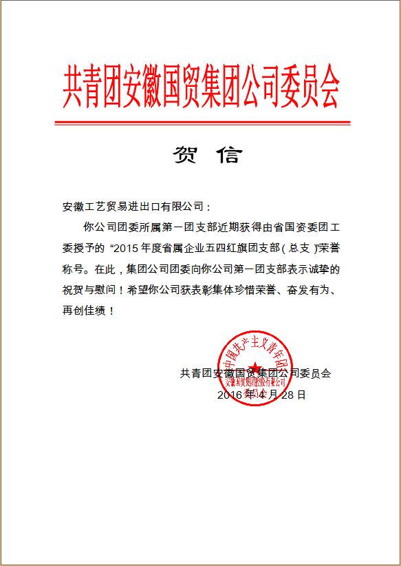 ?為表彰2015年度省屬企業各級團組織和廣大團員青年、團干部在企業改革實踐和持續健康發展等方面做出的新貢獻,省國資委團工委于近期開展了2015年度 “省屬企業優秀共青團員”、“省屬企業優秀共青團干部”和、“省屬企業五四紅旗團支部(總支)”和“省屬企業五四紅旗團委”的集中評選和表彰活動。安徽工藝貿易進出口有限公司團委所屬第一團支部獲得由省國資委團工委授予的“2015年度省屬企業五四紅旗團支部(總支)”榮譽稱號。?