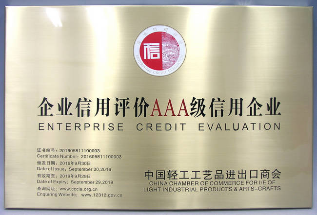 ? ? 公司繼2009年首次獲評企業信用評價AAA級信用企業后,連續多次獲評AAA級榮譽, 并于今年再次被中國輕工工藝品進出口商會授予AAA級信用企業證書。