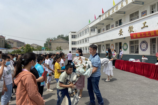 5月28日,公司董事長薛穎、工會主席粟廣慰組織公司團委一行年輕人,在“六一”前夕來到五河縣“安徽工藝光彩小學”慰問師生,并向師生送上慰問金和慰問用品。家用紡織品分公司趙克勇經理捐贈了實物,也給予了大力支持。
